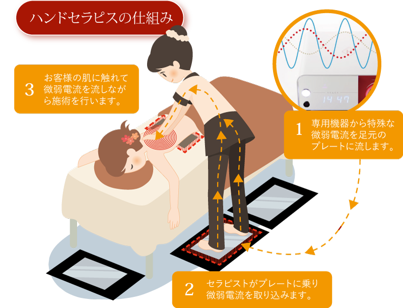 お客様と触れ合うセラピストにも微弱な電気が流れるため、